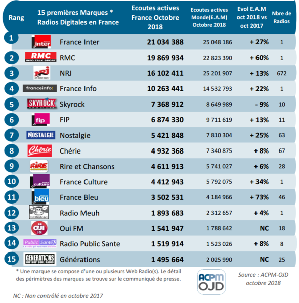 Ci-dessous le Top 15 des radios digitales. Cliquez ici pour voir le classement complet.
