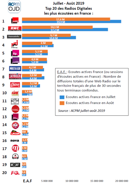 L’été 2019 confirme la croissance de l’audio digital, la diffusion contrôlée des Web Radios en France a progressé de 18% en un an (juillet-août 2019 vs 2018).