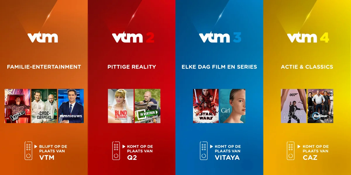 La chaîne familiale VTM sera une famille de 4 chaînes : VTM, VTM 2, VTM 3 et VTM 4. «VTM Kleurt je dag» revient. Q2, Vitaya et CAZ disparaissent