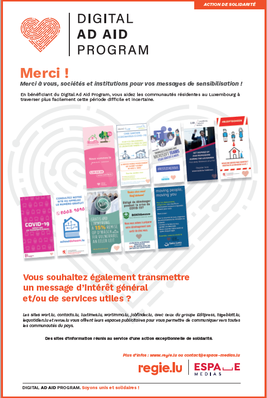 Néanmoins, Regie.lu n’a pas seulement conceptualisé pendant le confinement, elle a aussi agi concrètement pour soutenir ses clients : « L’arrêt brutal fin mars des investissements nous a immédiatement encouragé à fournir une réponse forte à l’urgence de la situation. Nous avons lancé en 24h le Digital Ad Aid Program afin d’aider les institutions ou sociétés qui avaient des messages d’intérêt général à diffuser, de le faire gratuitement sur nos sites. Leur offrir nos audiences a été un acte civique et de solidarité qui nous est apparu évident. »