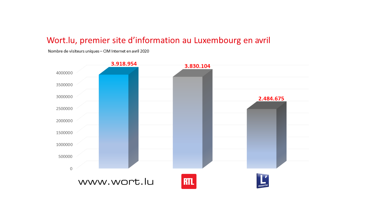 En avril, le site de news Wort.lu s’est placé en tête du classement avec 3.918.954 visiteurs uniques mensuels par mois, devant RTL et L’Essentiel. Les chiffres annuels des consultations des sites internet de Regie.lu ont explosé : +294% pour Contacto.lu, +38% pour Luxtimes.lu et +111% pour Wort.lu, sur la période mai 2019 à mai 2020.