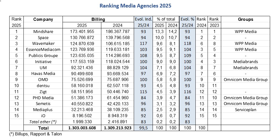 Avec une croissance (+3%) de sa part de marché jusqu’à 32,4%, le groupe WPP Media confirme encore sa place de leader devant Mediabrands et Omnicom Media Group. Le classement des groupes reste inchangé par rapport à celui de 2024 et 2023.