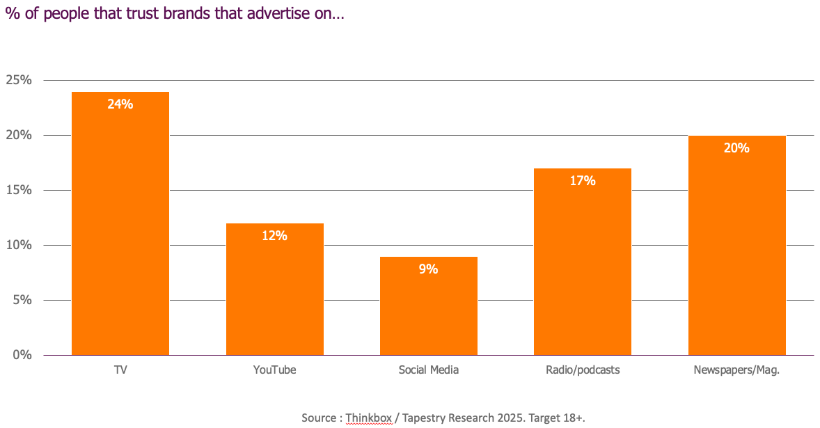 Deux fois plus de personnes font confiance aux marques qui font de la publicité à la télévision qu’à celles qui font de la publicité sur YouTube.